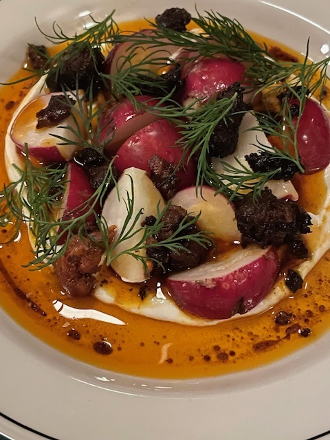 We started this meal with a beautifully presented and very tasty dish of fresh cherry belle radishes accompanied by chorizo, roast garlic and yoghurt. It was a delicious combination.