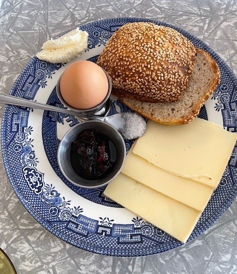 You can see a picture of our eggs and cheese plate immediately below. There is a soft boiled egg (from Little Farm and particularly delicious), some excellent bread from the local Hunter Bread, and three slices of very good cheese plus some tasty poached fruits (plums?).