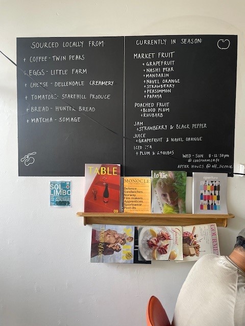 On another wall there was a blackboard with the day’s dishes prominently displayed. Notice that each of the suppliers are mentioned as well as the seasonal fruits that are available. You will also note the quality of the reading material displayed under the menu board.