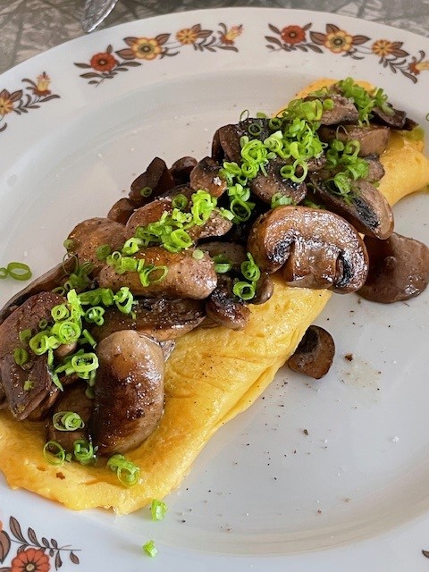 You can see a photo of our omelette below. The omelette had been cooked perfectly – soft on the inside and firm mon the outside with very tasty mushrooms covering the omelette.